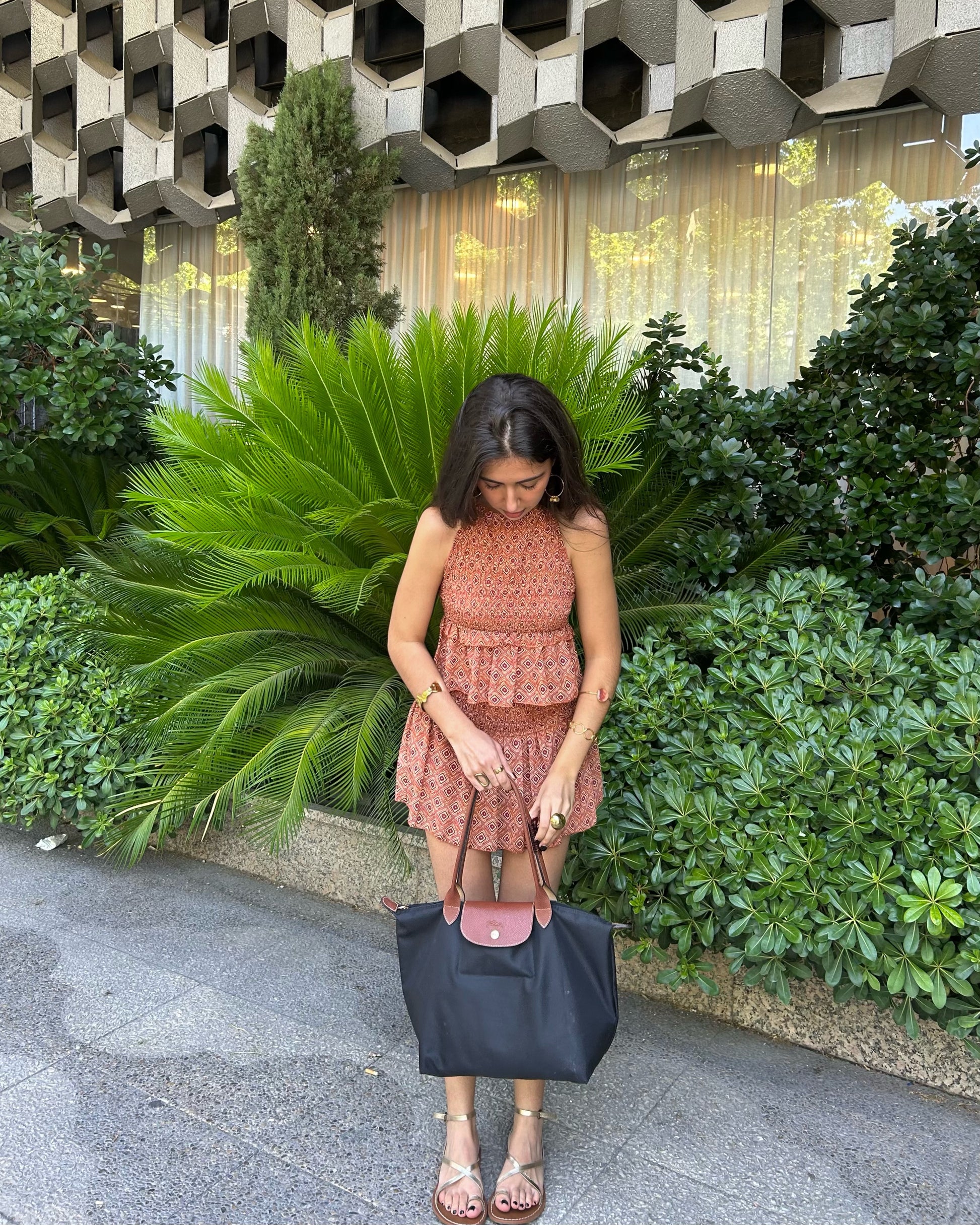 Una falda corta preciosa y súper cómoda, en un tono anaranjado teja con detalles marrones que la hace cálida, versátil y fácil de combinar. A primera vista es una falda con muchísimo vuelo y caída fluida, pero en realidad es una falda pantalón: lleva un short del mismo tejido integrado por debajo, lo que te permite moverte con libertad sin preocuparte de nada.