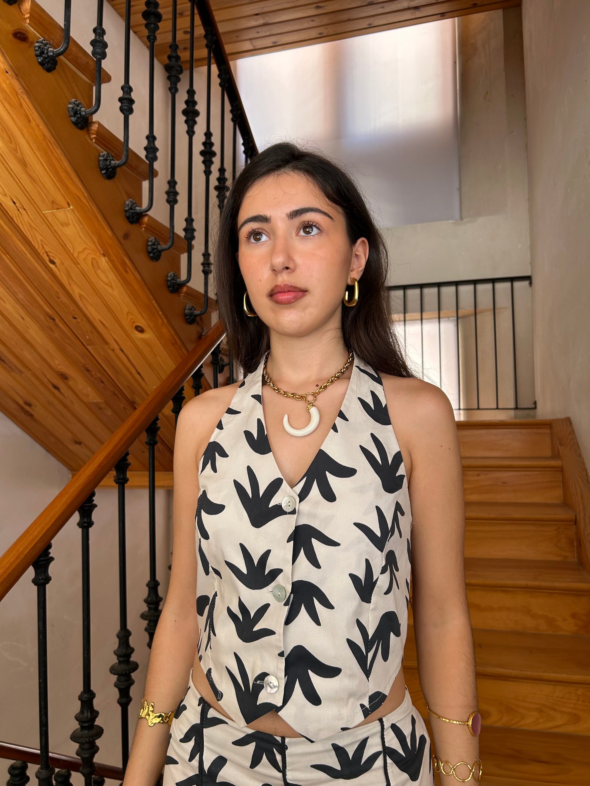 Está diseñado en formato chaleco de escote halter, con una silueta entallada que realza la figura gracias a costuras verticales que estilizan el pecho y tres botones decorativos en la parte frontal que le dan un aire estructurado y elegante.