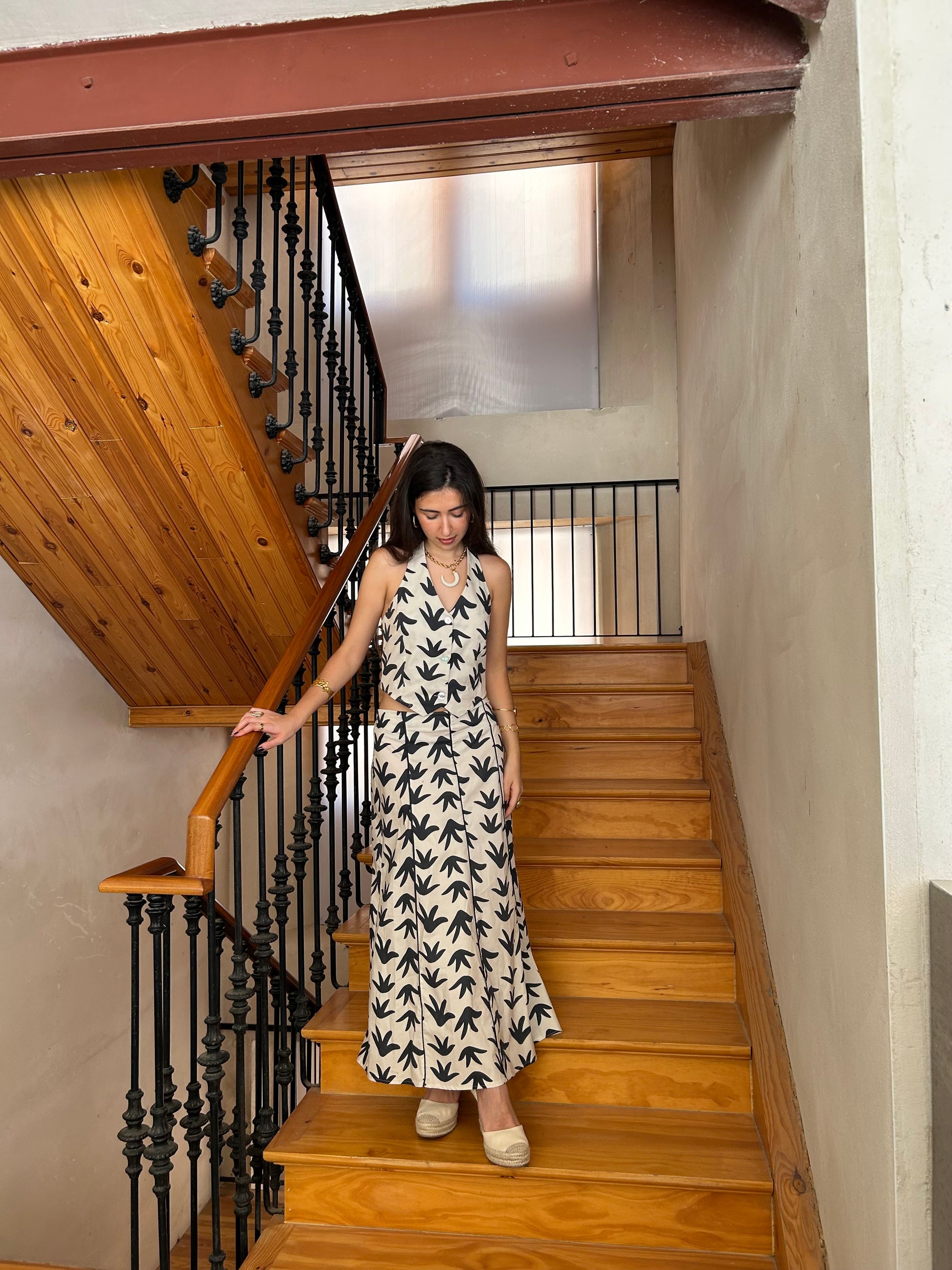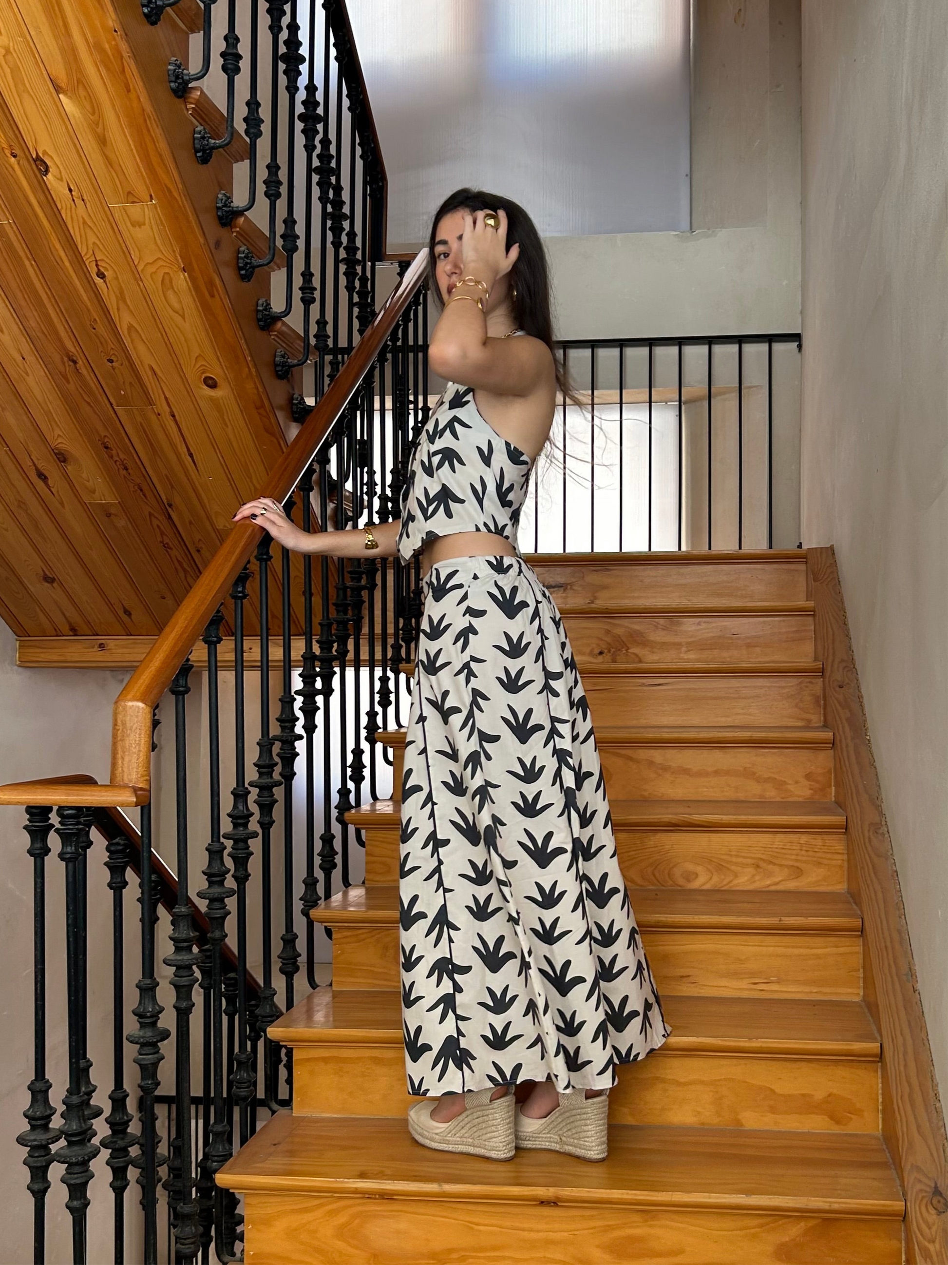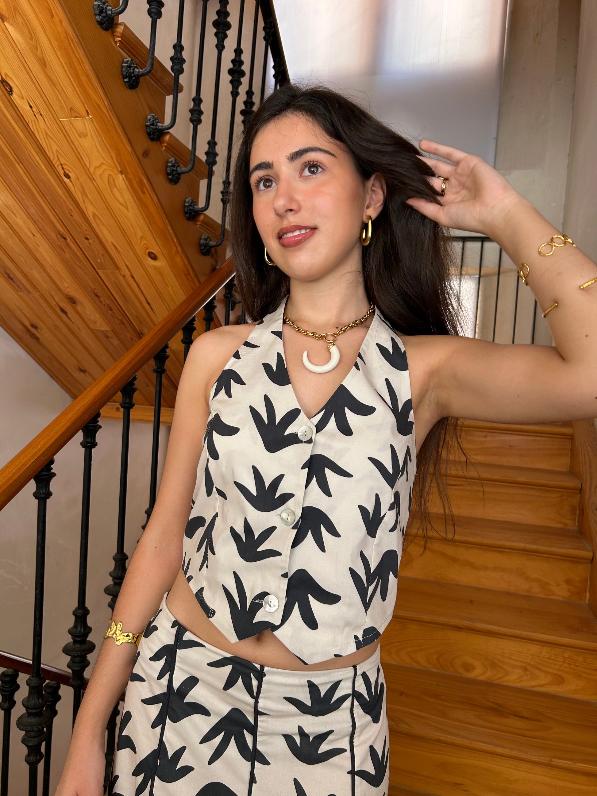 Es la pieza ideal para combinar con la falda del mismo estampado, aunque también funciona genial con vaqueros o pantalones de lino para crear looks más relajados pero igual de especiales.