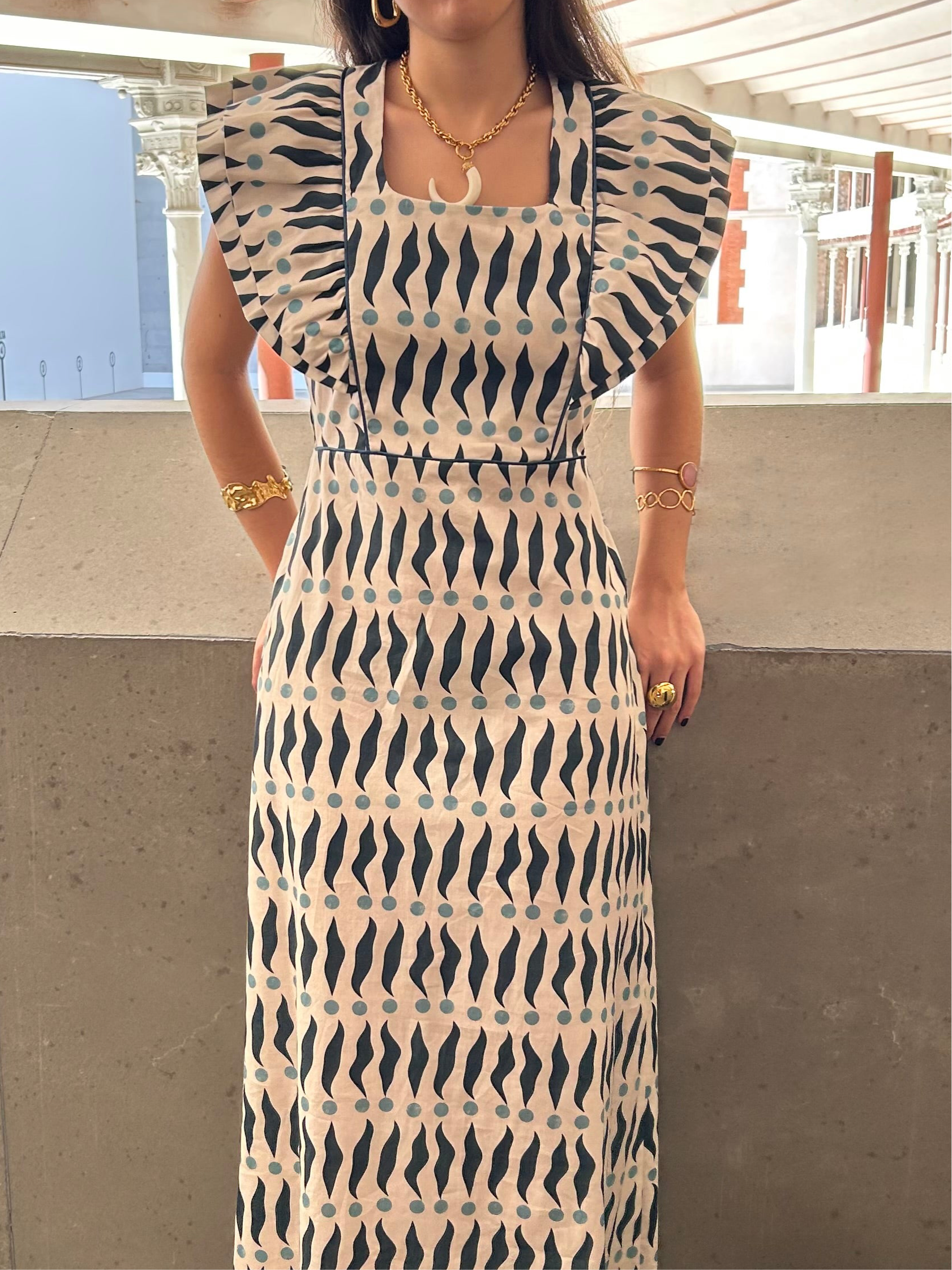 Este vestido está confeccionado en 100% algodón, con un escote cuadrado que enmarca el pecho de forma preciosa y un detalle marcado en la cintura que estiliza la silueta, es ideal para ocasiones especiales o para un look sofisticado pero fresco.