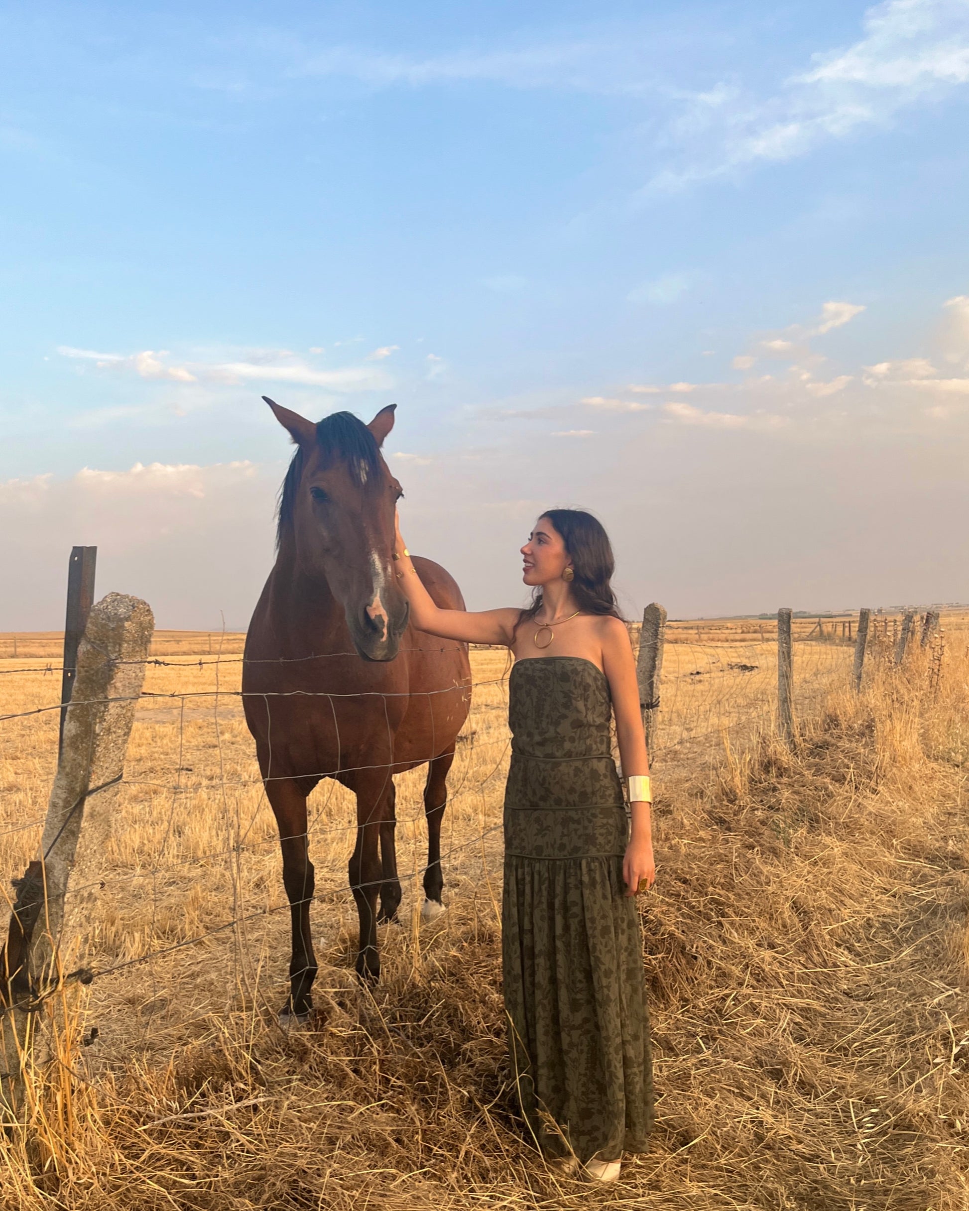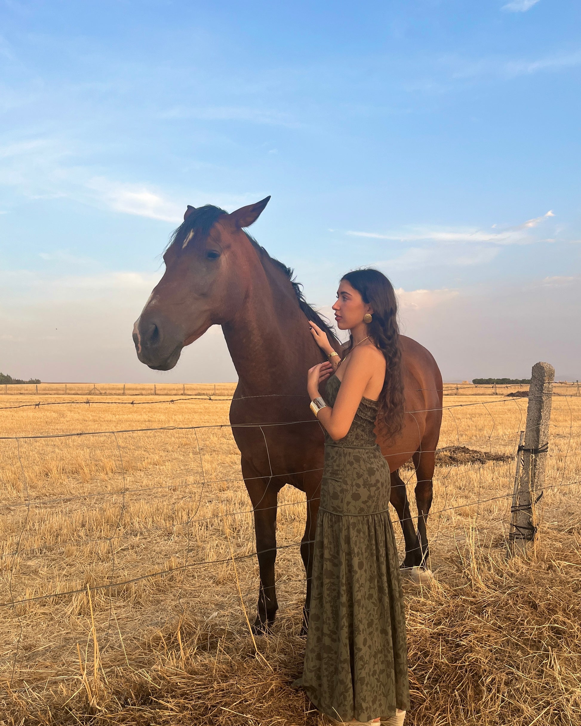 Vestido largo sin tirantes en color verde oliva, con estampado floral en tono más oscuro. Tiene corte recto en la parte superior y costura a la altura de la cintura que da paso a una falda amplia con caída fluida. El tejido es ligero y cómodo, ideal para todas las épocas del año.